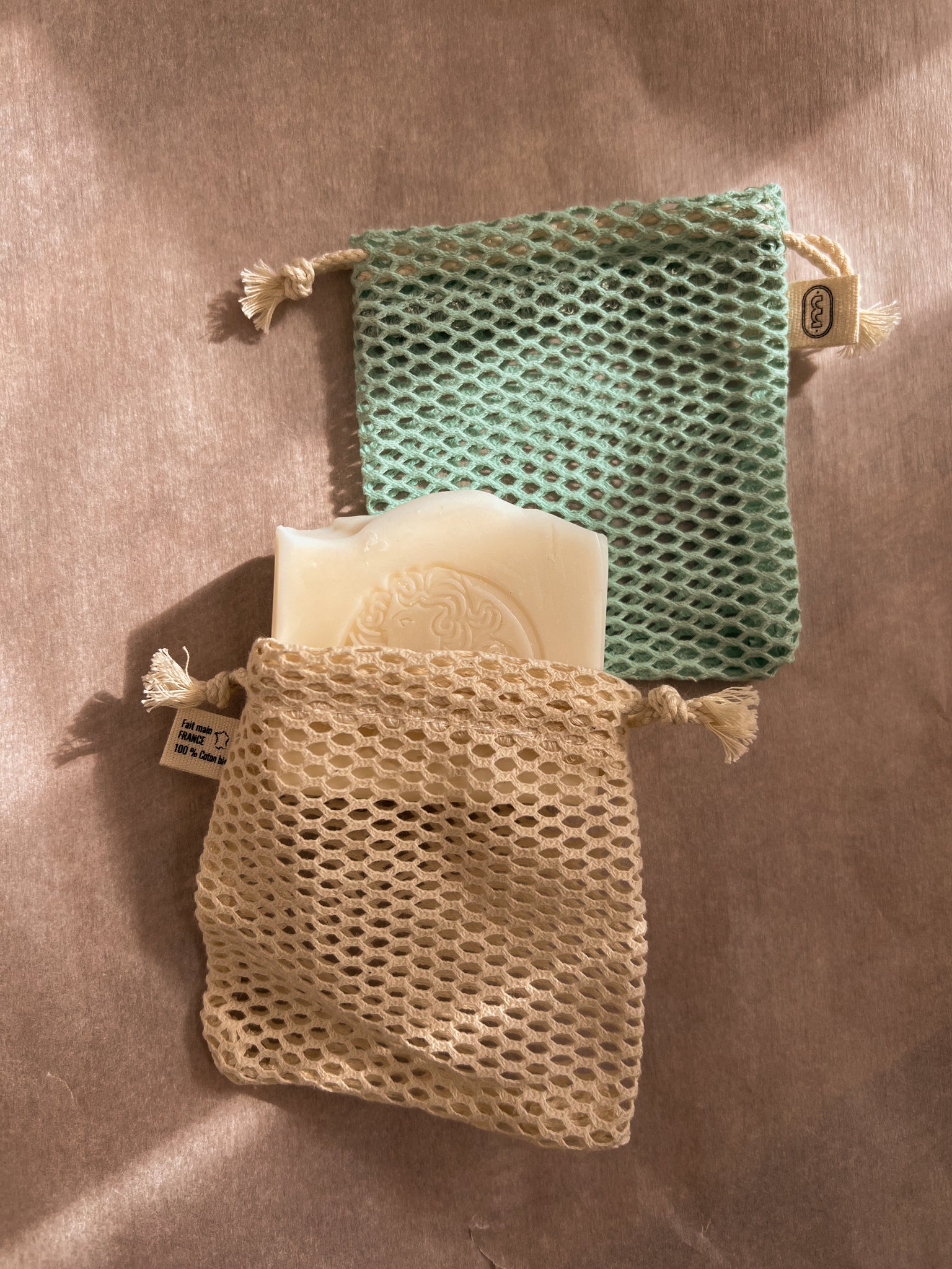 Our new made in France 100% cotton soap saver bags will hold your soap and help lather the bar or can act as a pouch for when your bar dwindles down to tiny pieces.